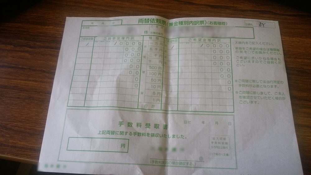 窓口で交換用の用紙(両替依頼票)をいただき、記入していきます。
