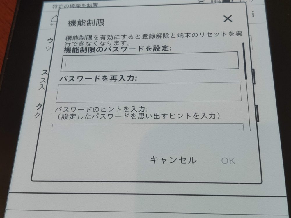 機能制限のパスワードを忘れた場合は残念ながらkindle端末の初期化が必要です。