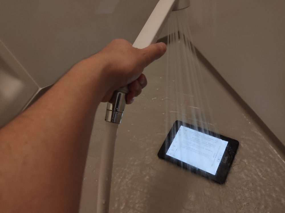 kindleを使用中にシャワーを読むつわものはなかなかいないと思います(笑)。しかし、近くにおいてあって、kindleもシャワーを浴びることは多々あります。ということで、その状況を再現。