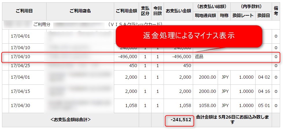 ”合計金額は5月26日にお振込み致します”とあり、返金金額が使用金額より多いと銀行に振り込まれる。